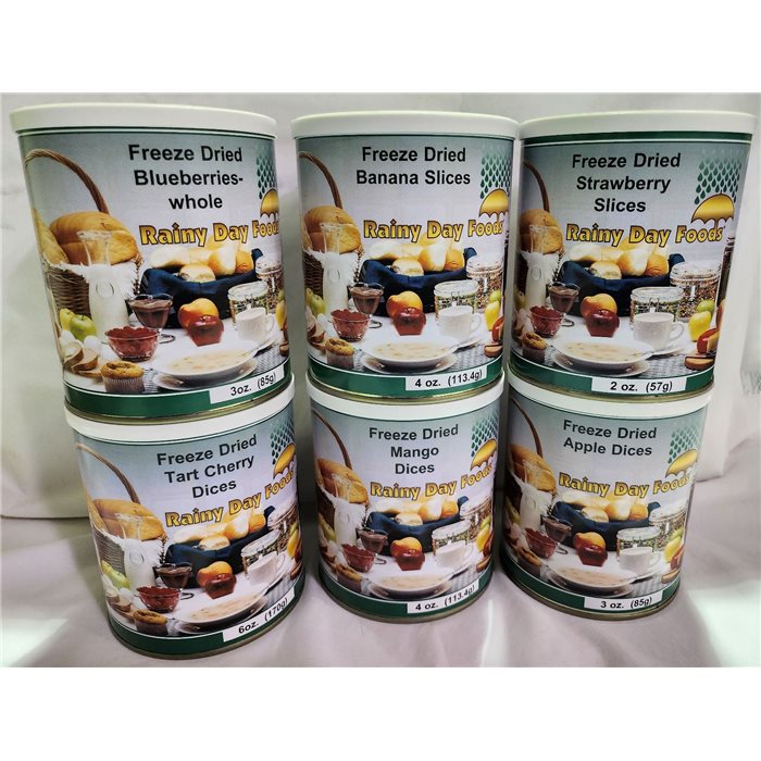 Rainy Day Foods offers this variety of 6 #2.5 cans of freeze dried fruit which lets you sample the best of all fruits. Try them for breakfasts, in cereals, salads, or desserts or just as a snack. You will want to come back for more.